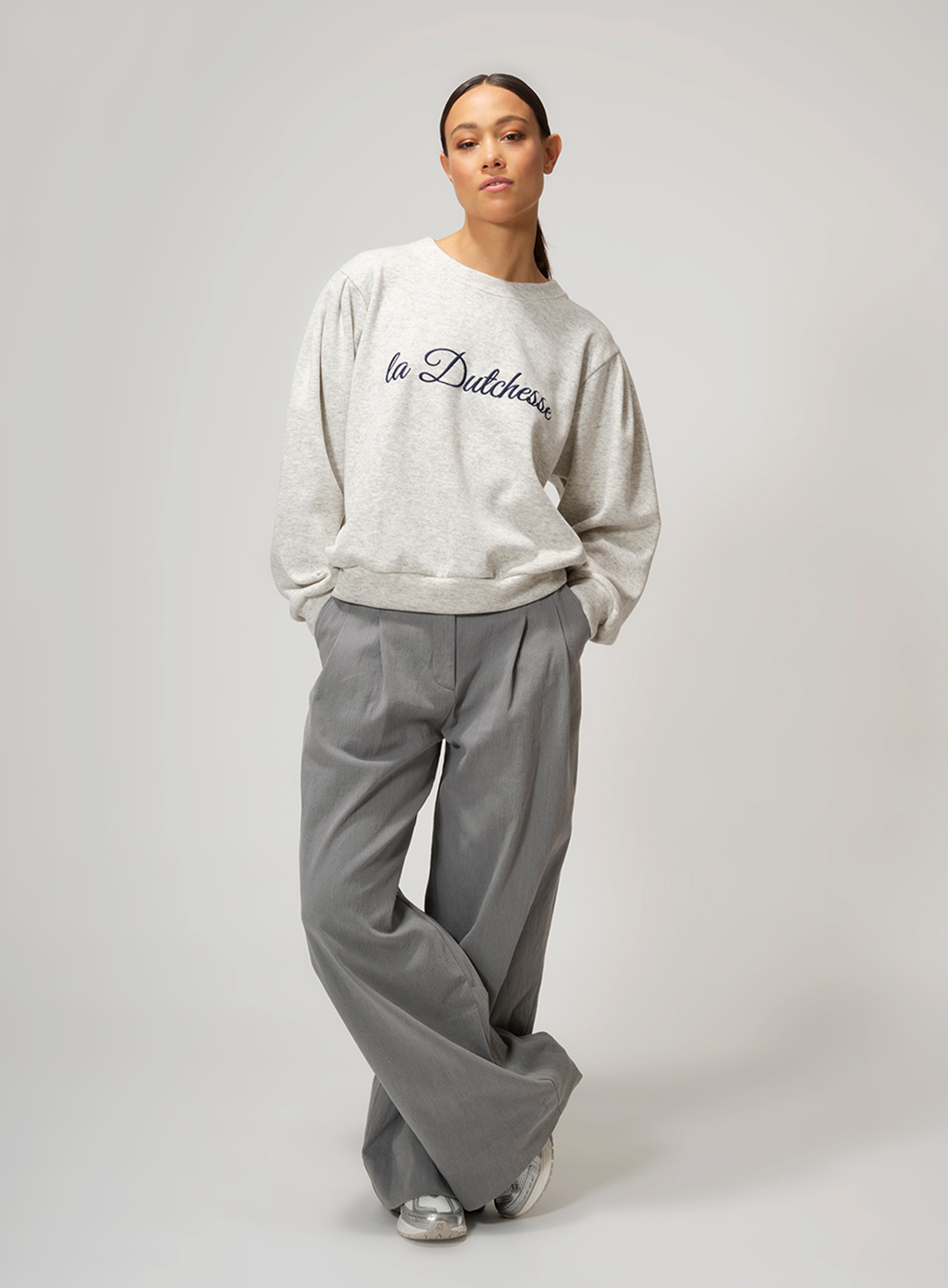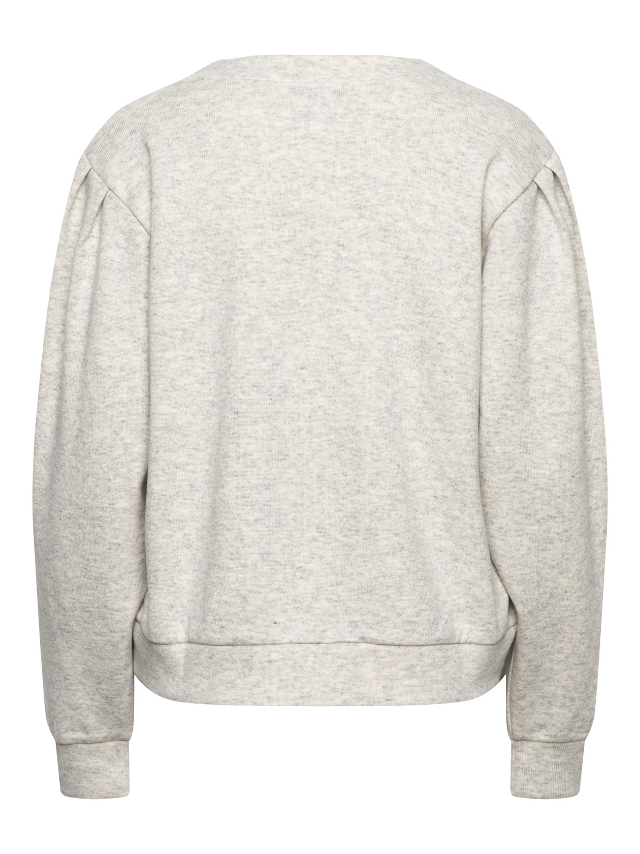 • Special edition sweater to celebrate Dutchess 20 years anniversary. Comfy sweater with long sleeves and pleats on the shoulder made of organic cotton in a light grey melange jersey with round neck and hem at the bottom, relaxed fit, model wears a size 36