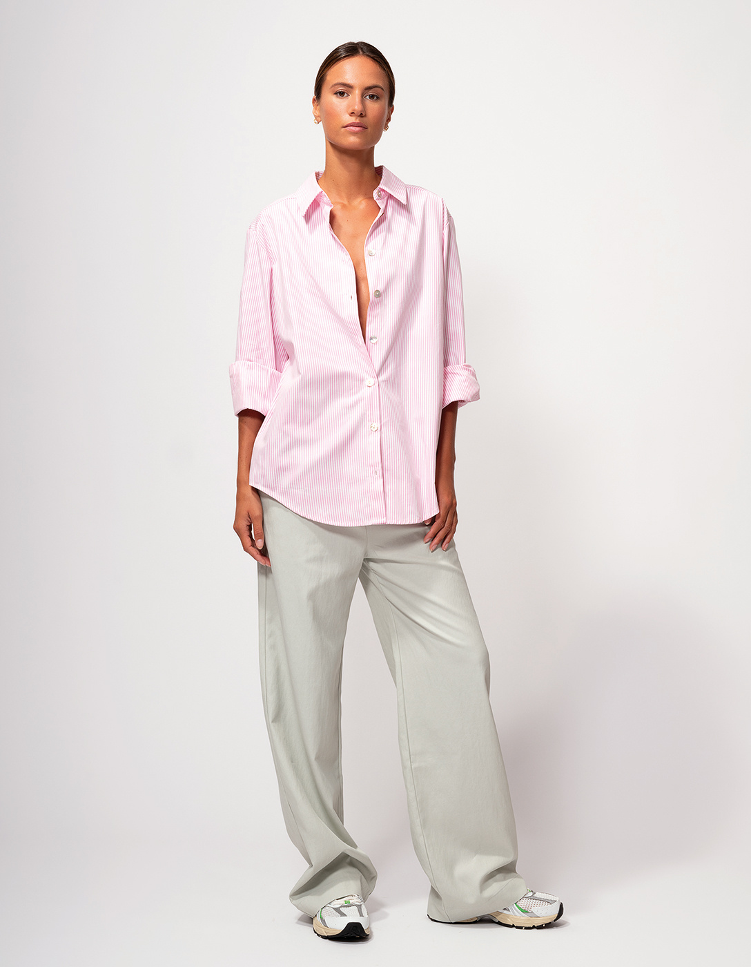 • Supple bio cotton striped shirt with collar and button closure. The shirt has long sleeves with cuffs, which you can roll up. The model is 1.78 and wears a size 36.