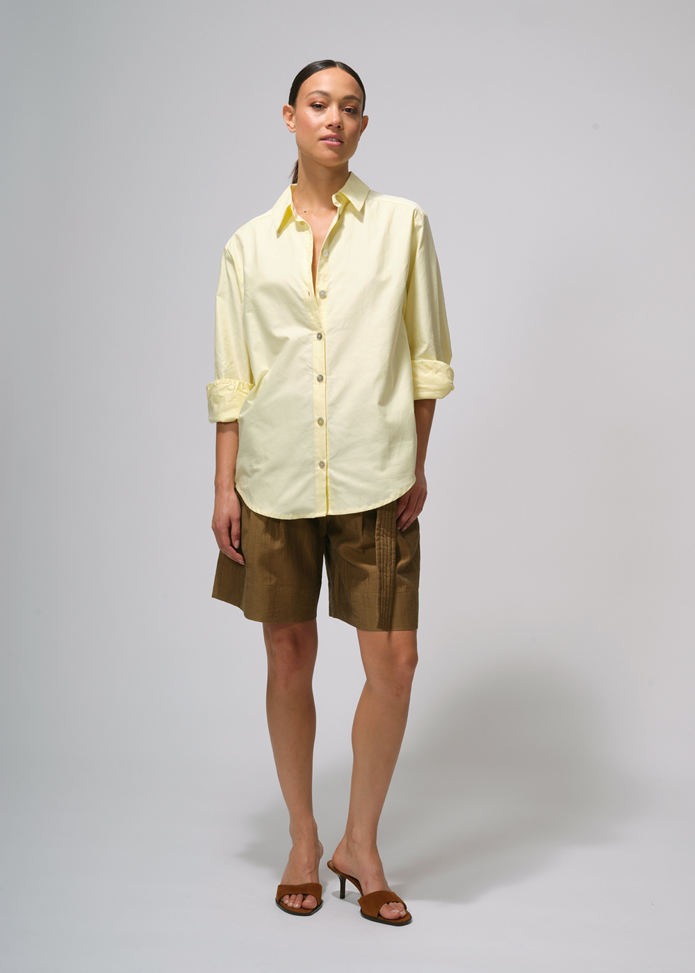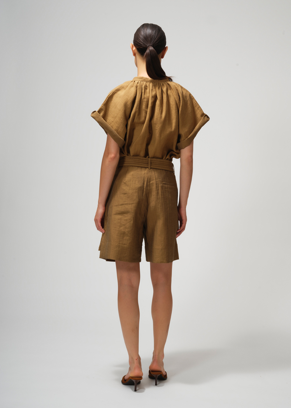 Trousers with pleats and wide flared legs, closing with a zipper, featuring hip pockets and a welt pocket at the back. These flared trousers are incredibly flattering. This pair of pants is made of a cotton/linen blend. The model is wearing a size 36.