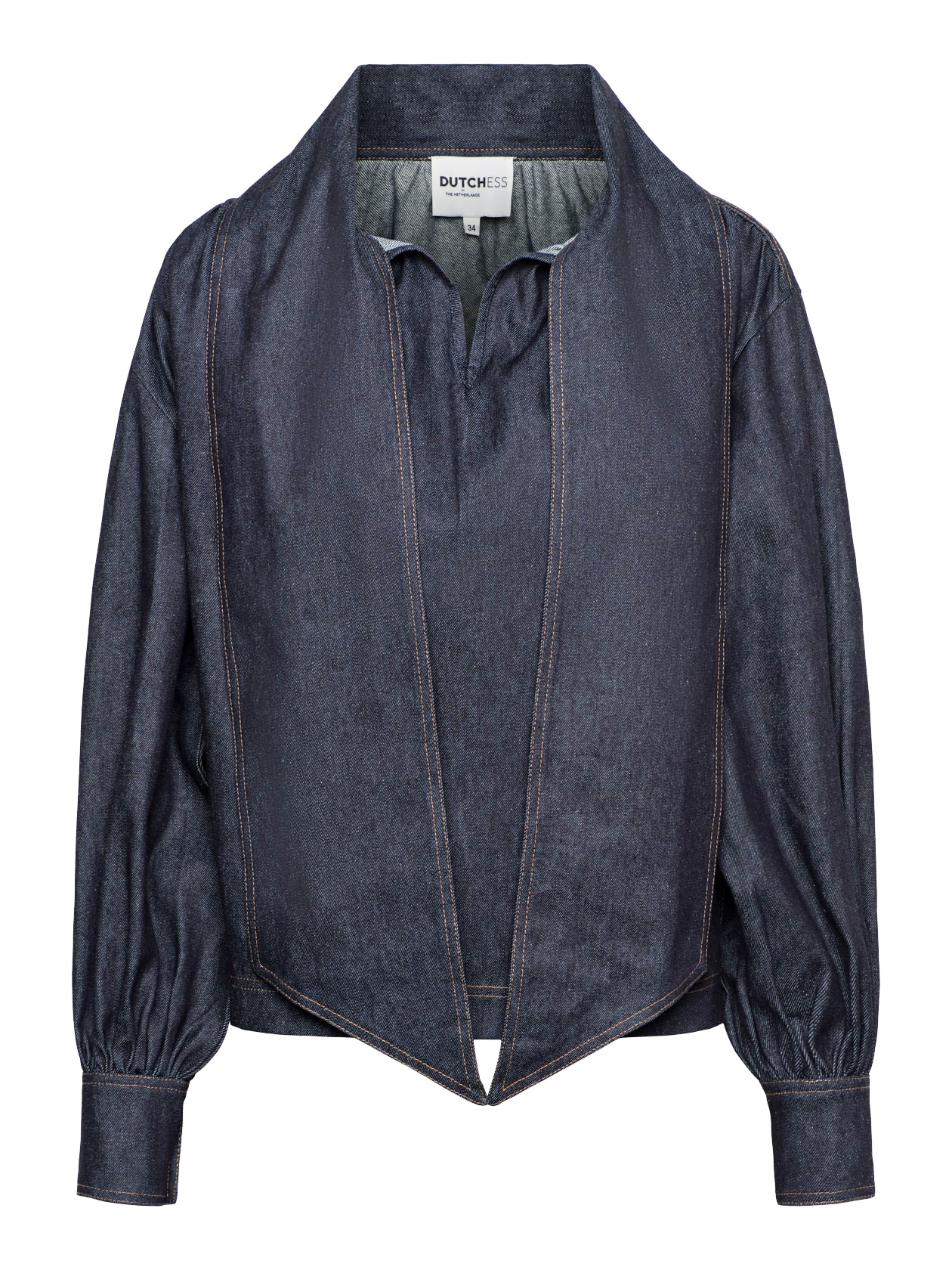 Dark jeans blouse with hidden button closure and narrow stand-up collar, shoulder yoke. Wide balloon sleeves with cuffs and mother of pearl buttons. Back yoke with box pleat for extra comfort. Model is 1.78 and wears a size 36.