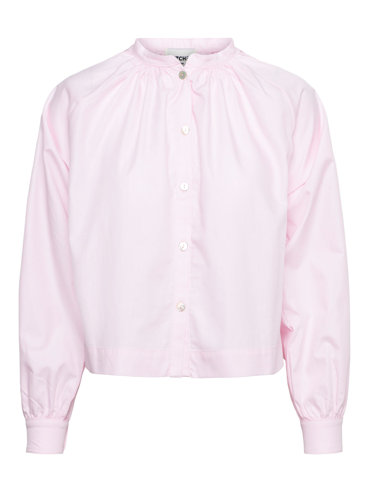 Light pink striped shirt with collar and button closure. The shirt has long sleeves with cuffs, which you can roll up. The model is 1.78 and wears a size 36.