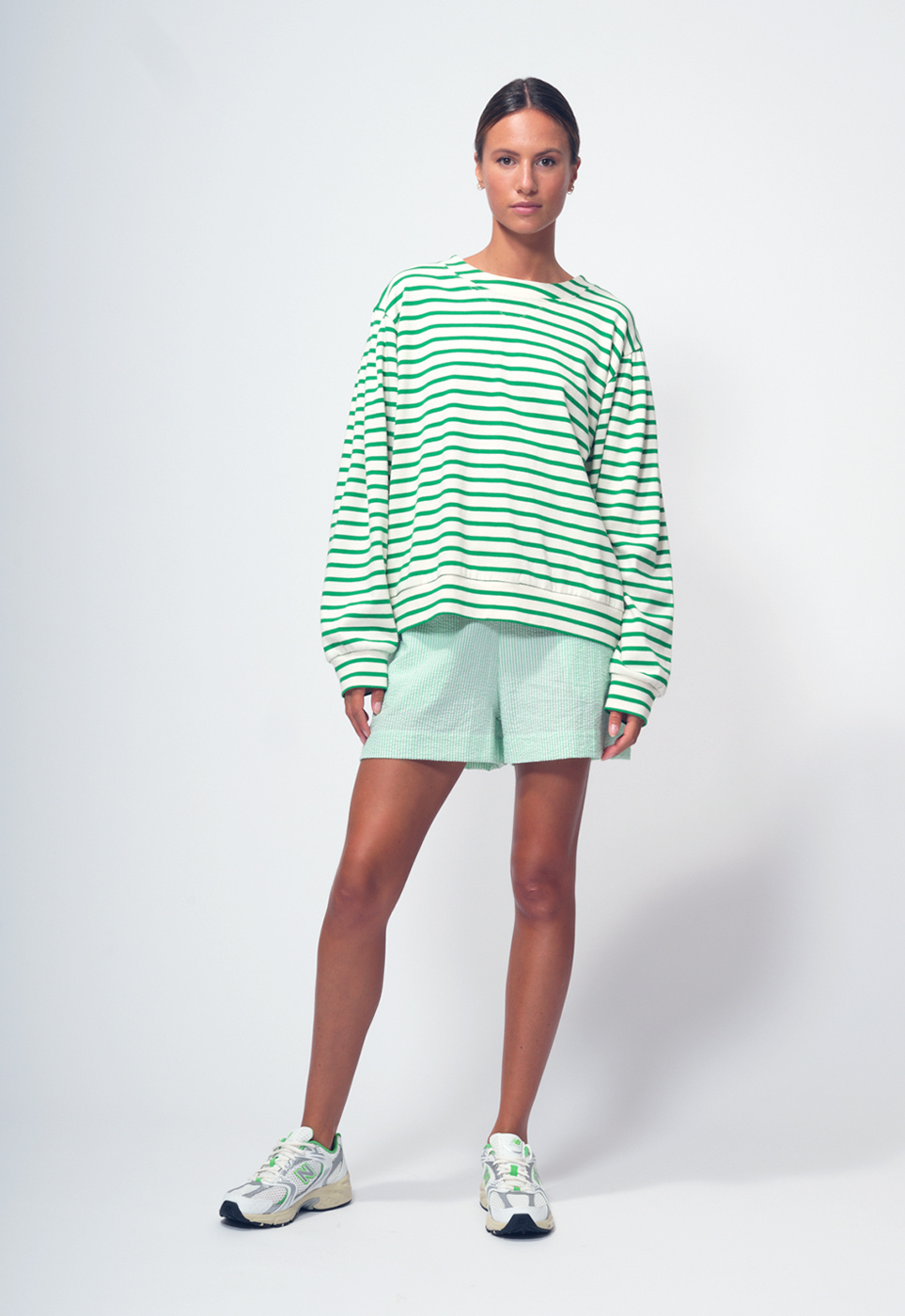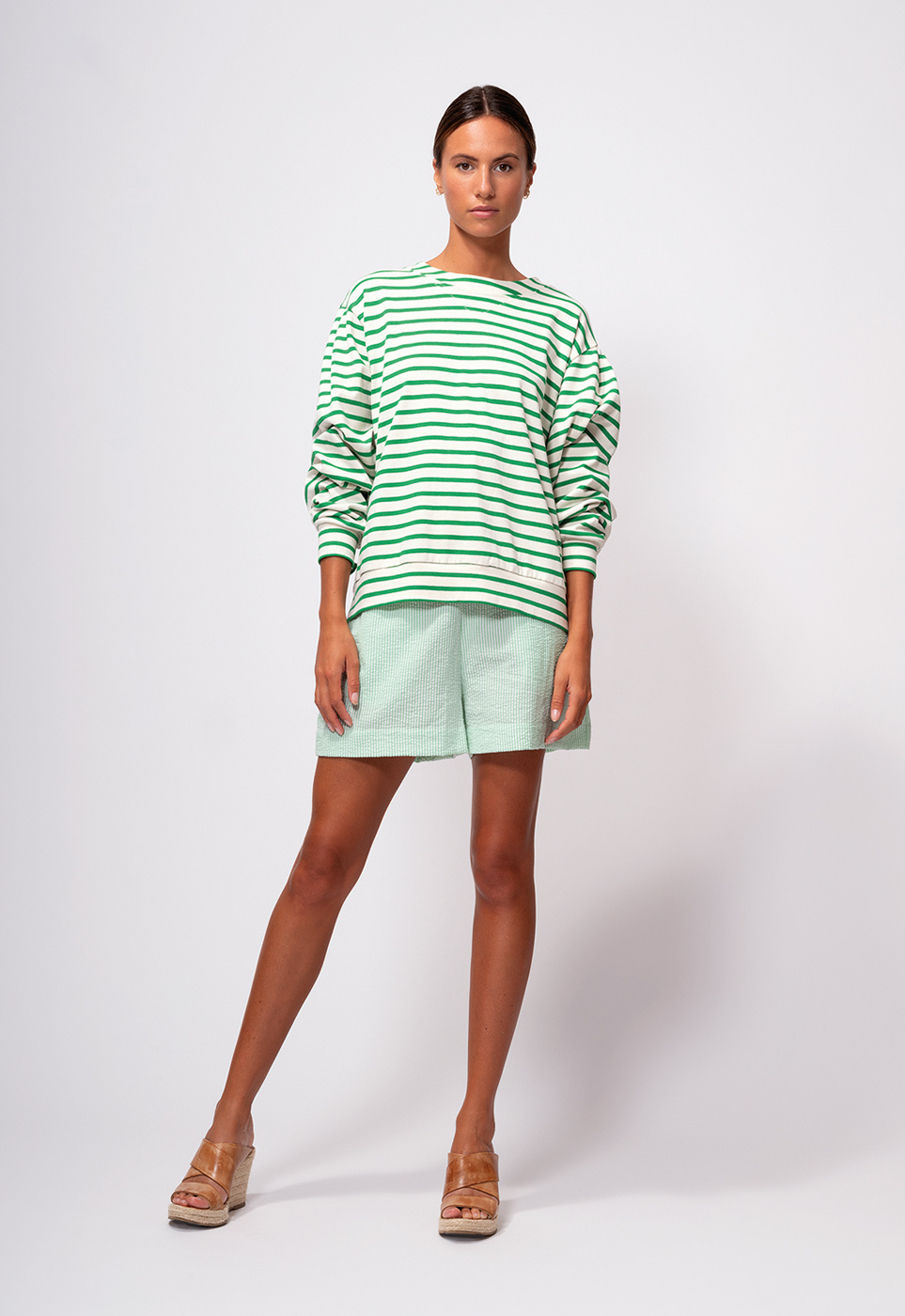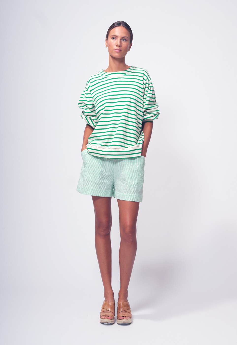 Really comfortable green/white striped shorts, shirred, elastic waist, pleats at the front, hip pockets . relaxed fit. Fits true to size, model wears a size 36. In the picture combined with the Maxime top.
