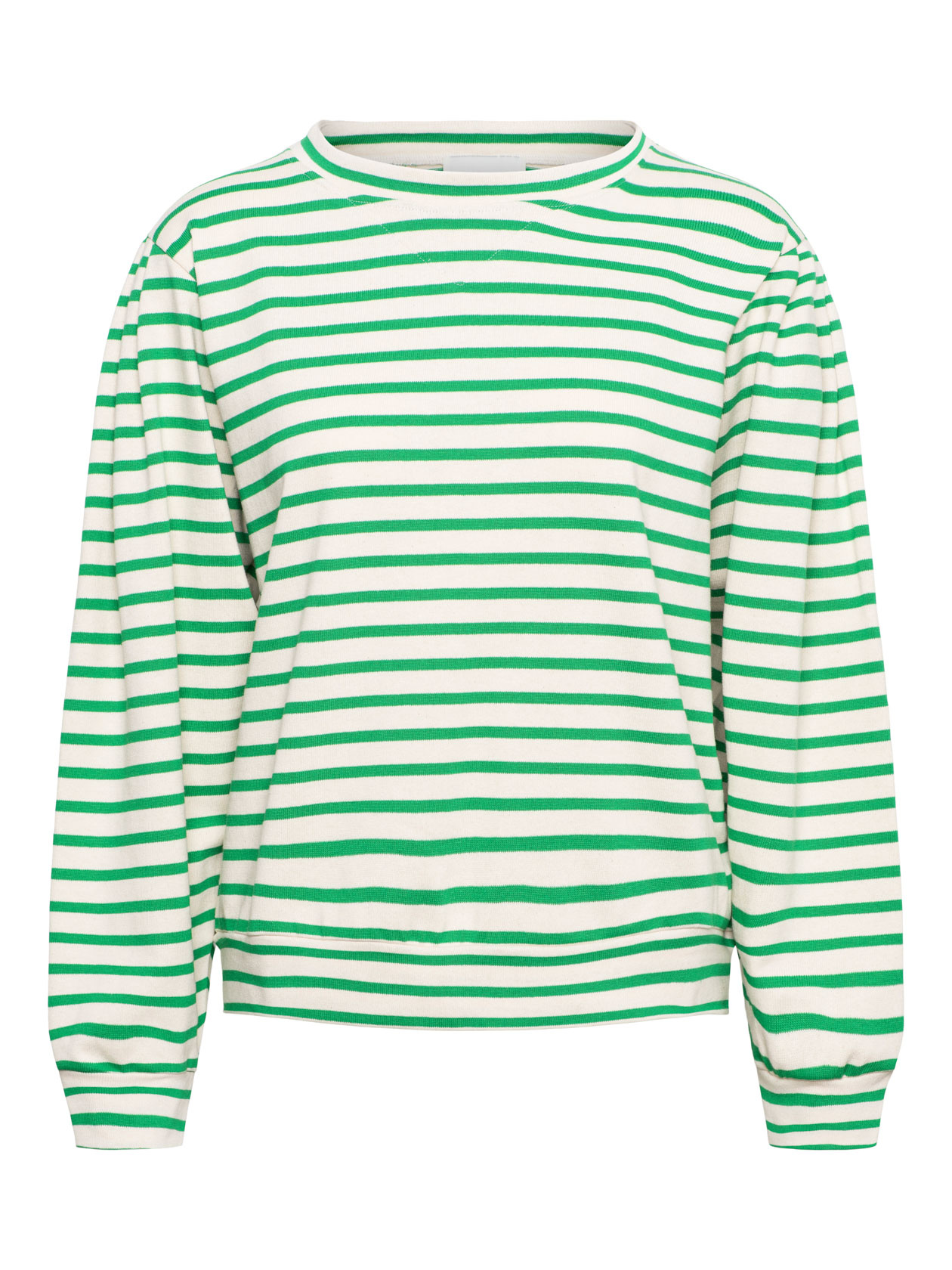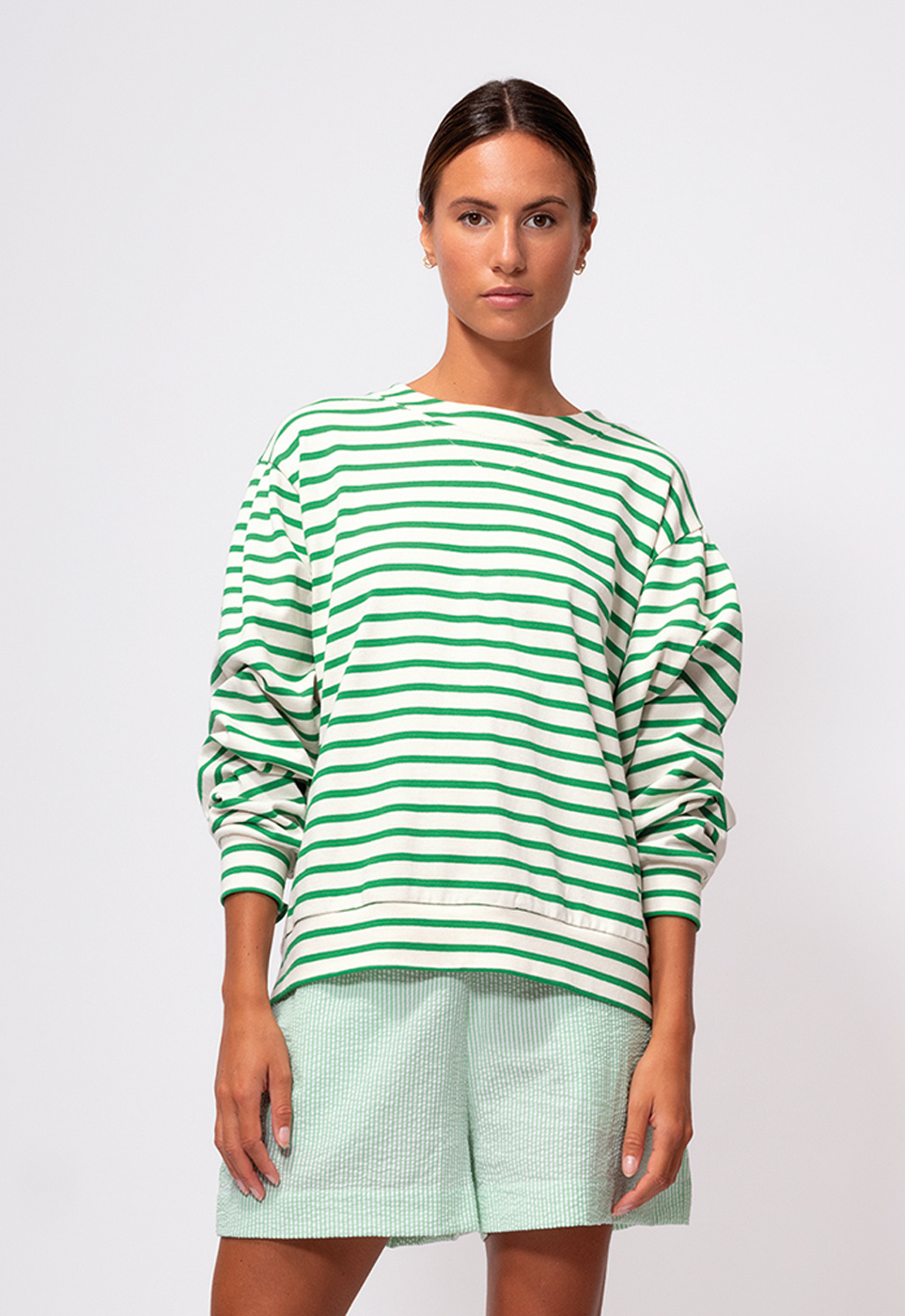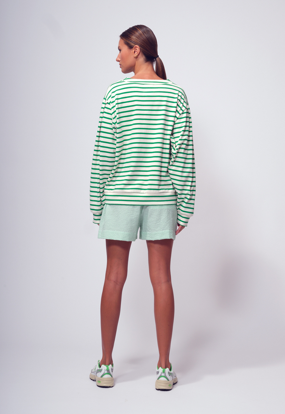 Really comfortable green/white striped shorts, shirred, elastic waist, pleats at the front, hip pockets . relaxed fit. Fits true to size, model wears a size 36. In the picture combined with the Maxime top.