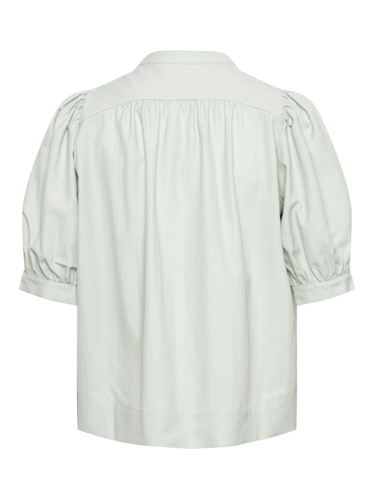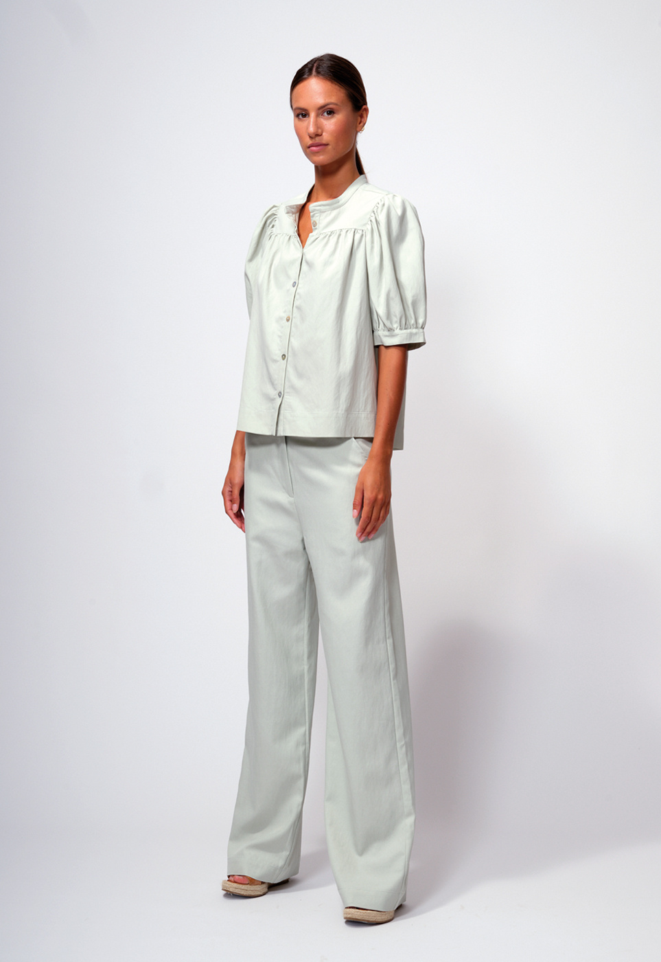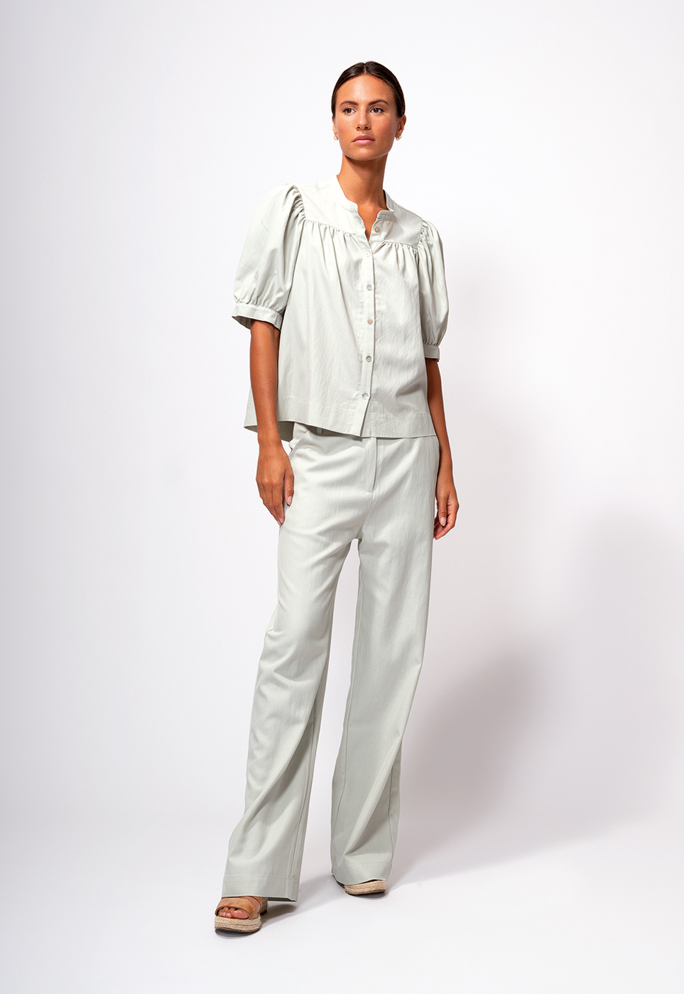 Supple bio cotton striped shirt with collar and button closure. The shirt has long sleeves with cuffs, which you can roll up. The model is 1.78 and wears a size 36.