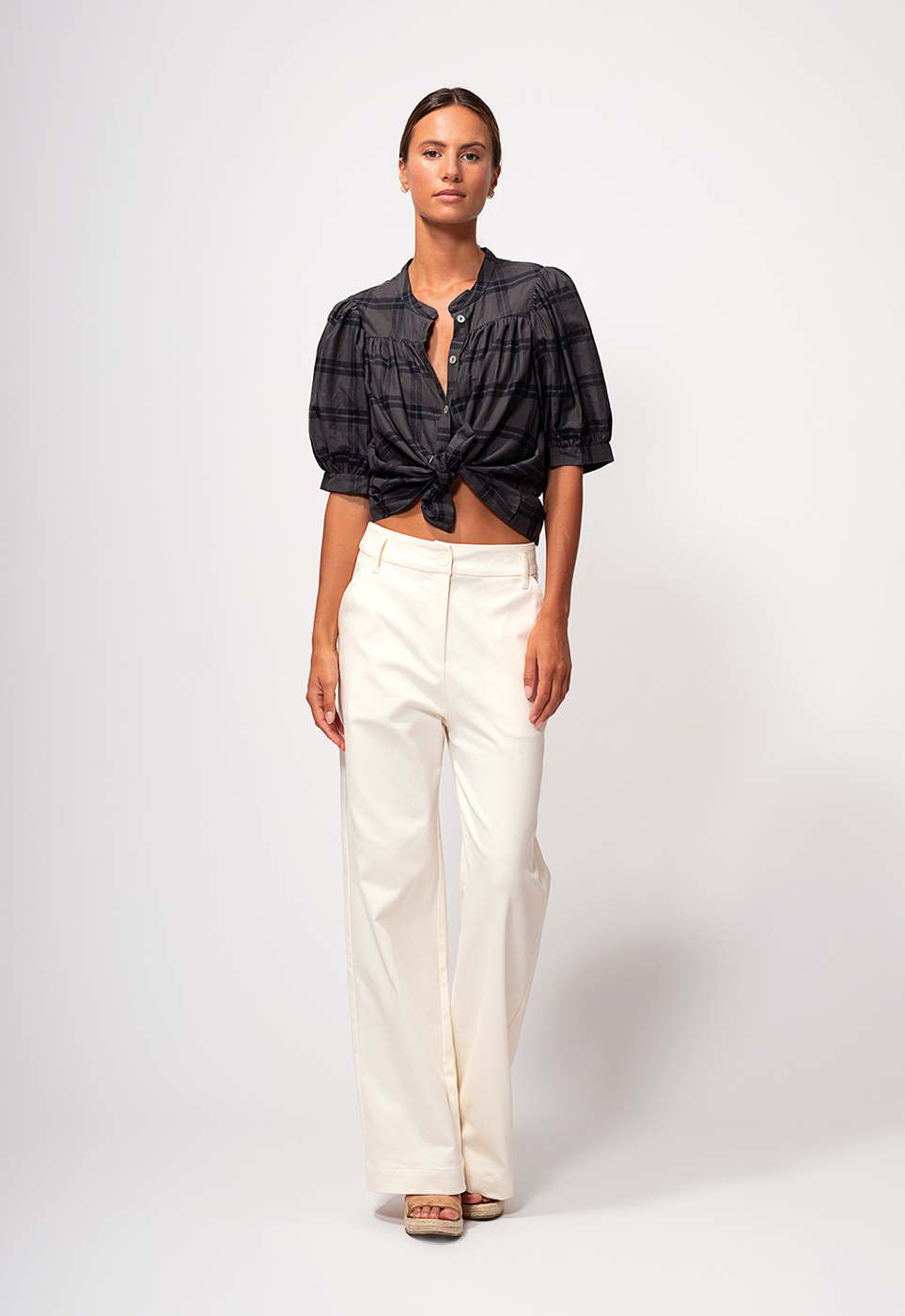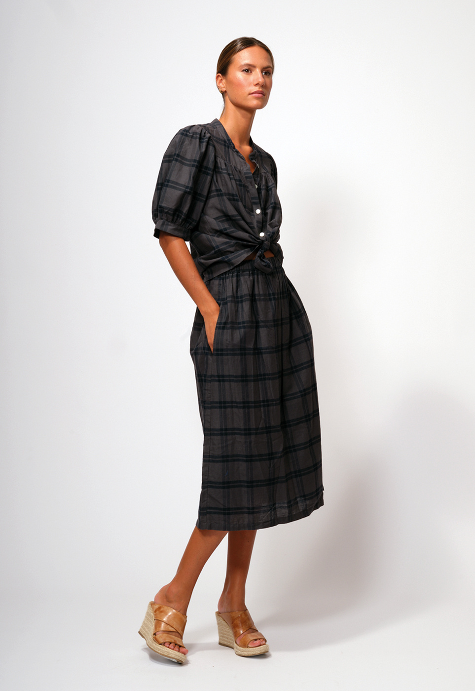 Incredibly flattering skirt made from handwoven Indian cotton with a front yoke and elastic at the back, side pockets. Made of 100% cotton, the size 36 has a length of 81 cm. In the picture combined with the Maxime blouse check.
