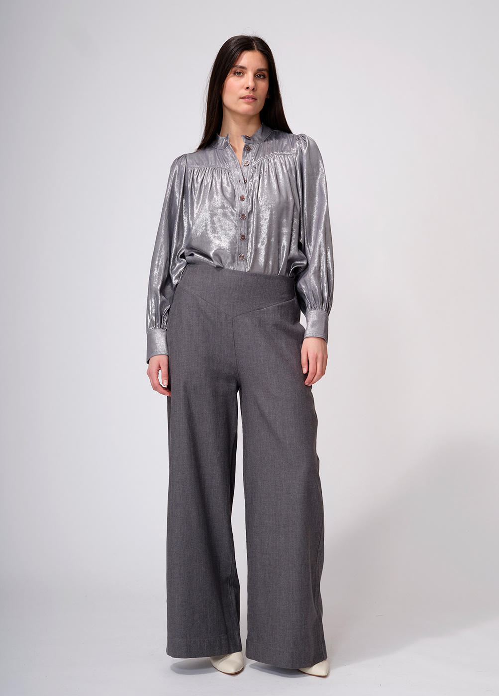 Very comfortable bottoms with v-shaped front yoke and elastic at the back, flared legs, hip pockets and a welt pocket at the back. These flared pants are incredibly flattering. Model wears a size 36