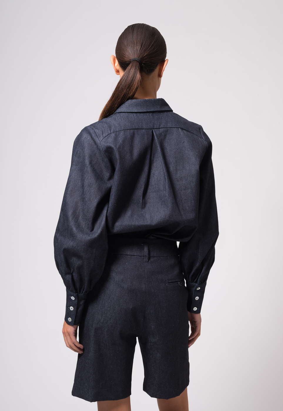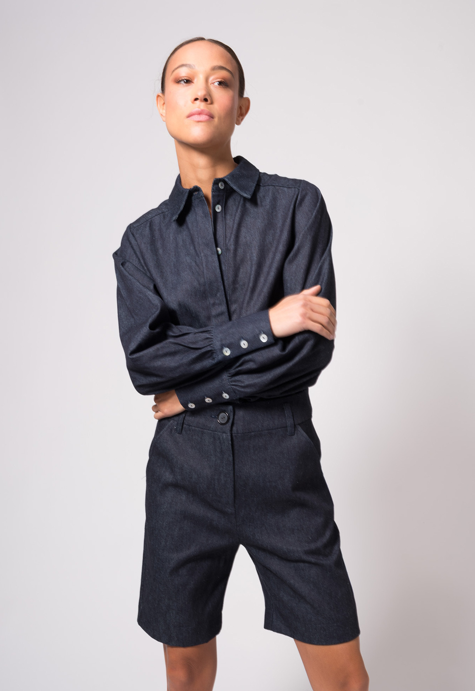 • Bermuda of sturdy dark jeans, front zipper, hip pockets and a welt pocket at the back, here combined with the deer blouse in dark jeans. The model is wearing a size 34.