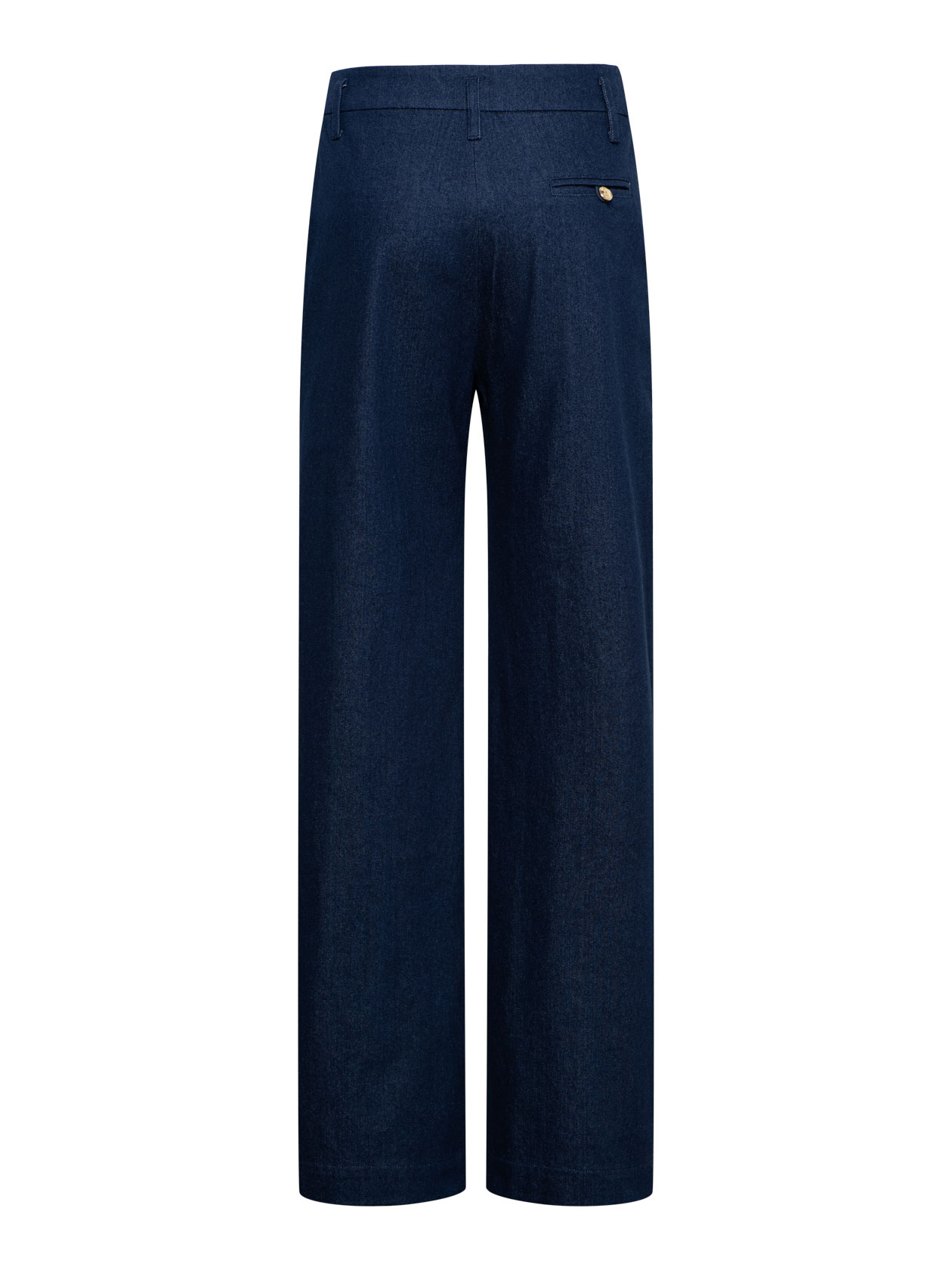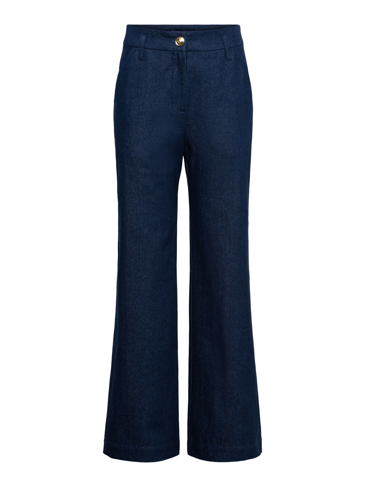 High waist wide leg pants with zip closure at the side, hip pockets with golden buttons, these wide-leg pants are incredibly flattering. This tailored pair is made from dark jeans.