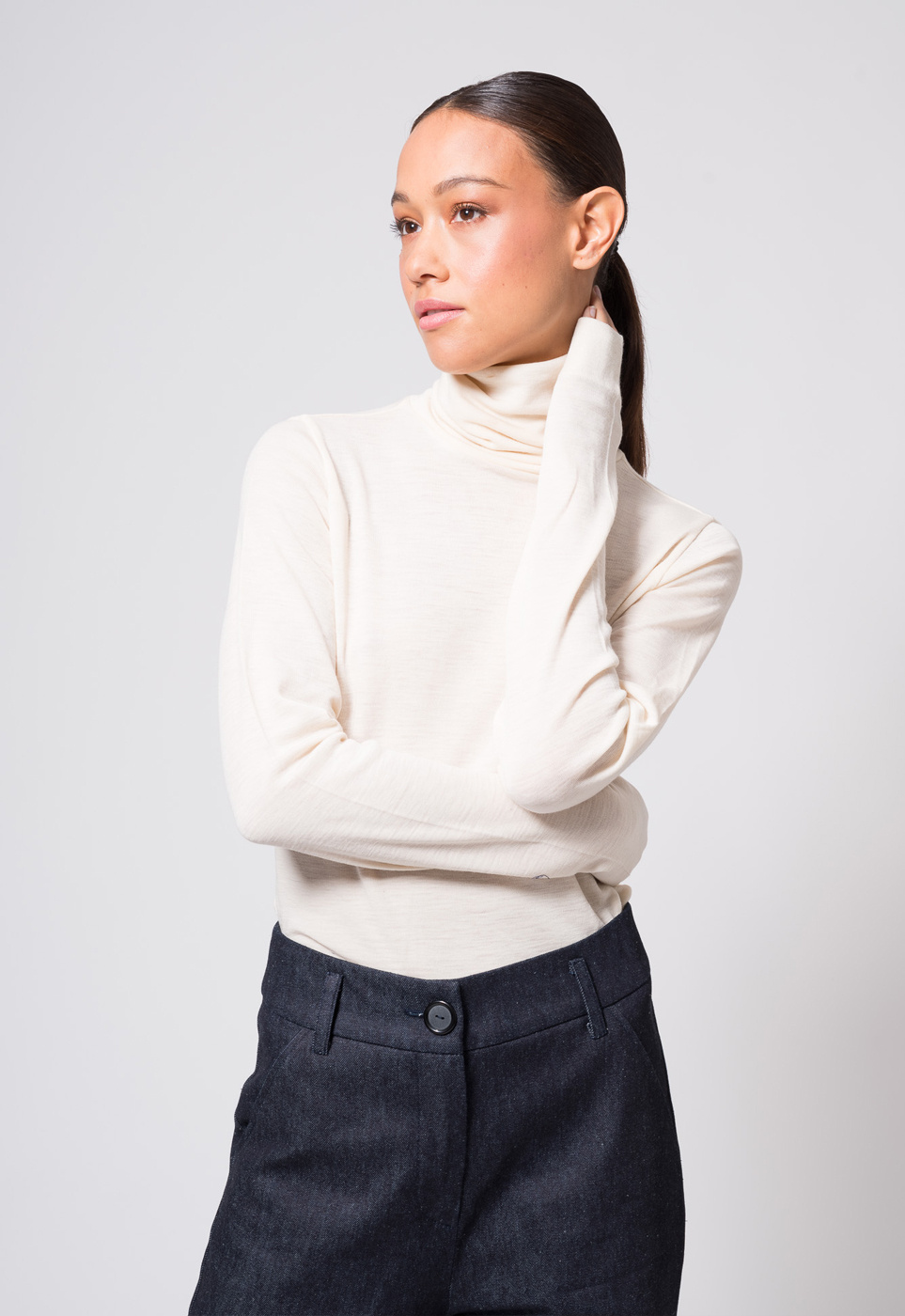 Trousers with pleats and wide flared legs, closing with a zipper, featuring hip pockets and a welt pocket at the back. These flared trousers are incredibly flattering. This pair of pants is made of 100% cotton. The model is wearing a size 36.