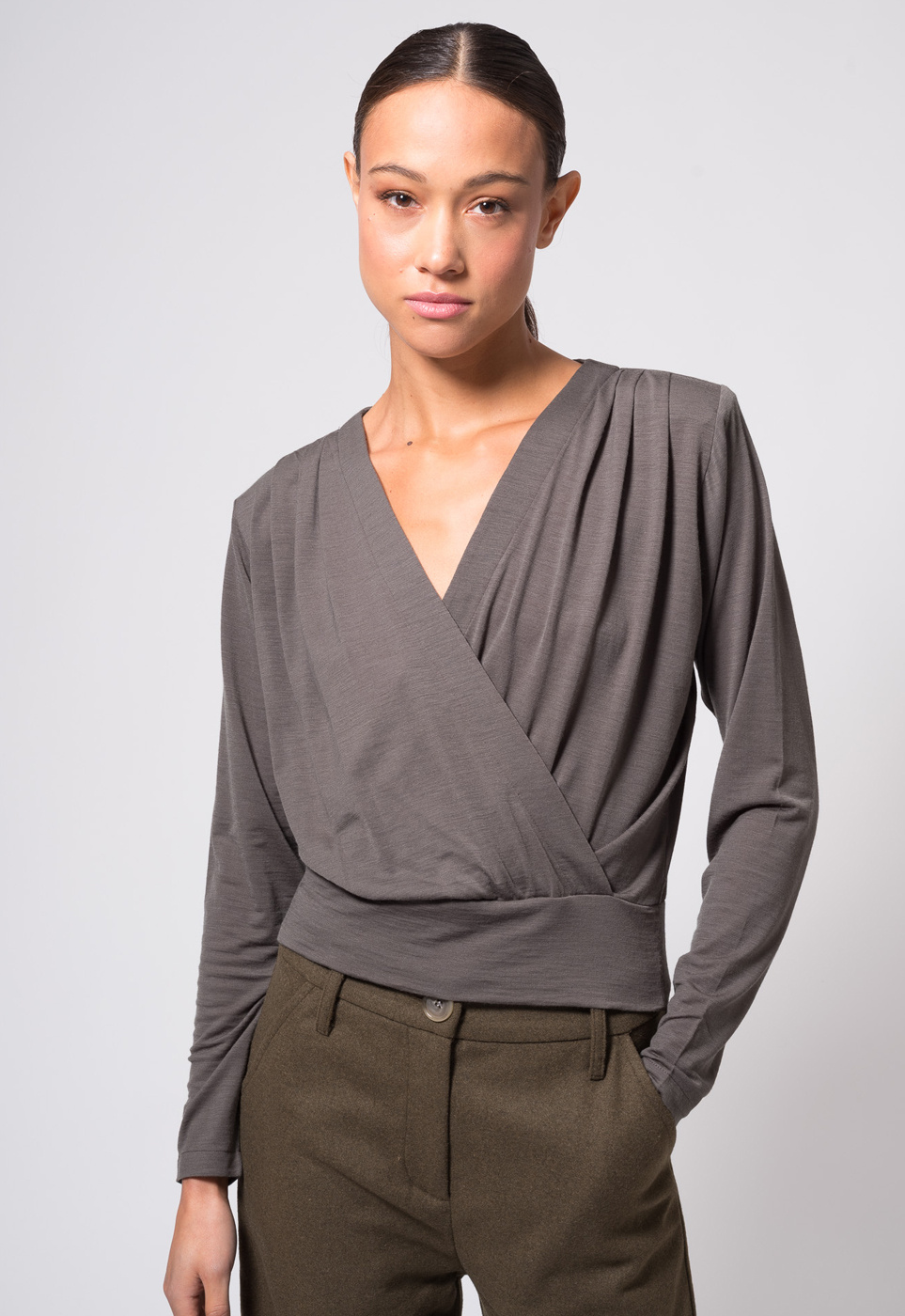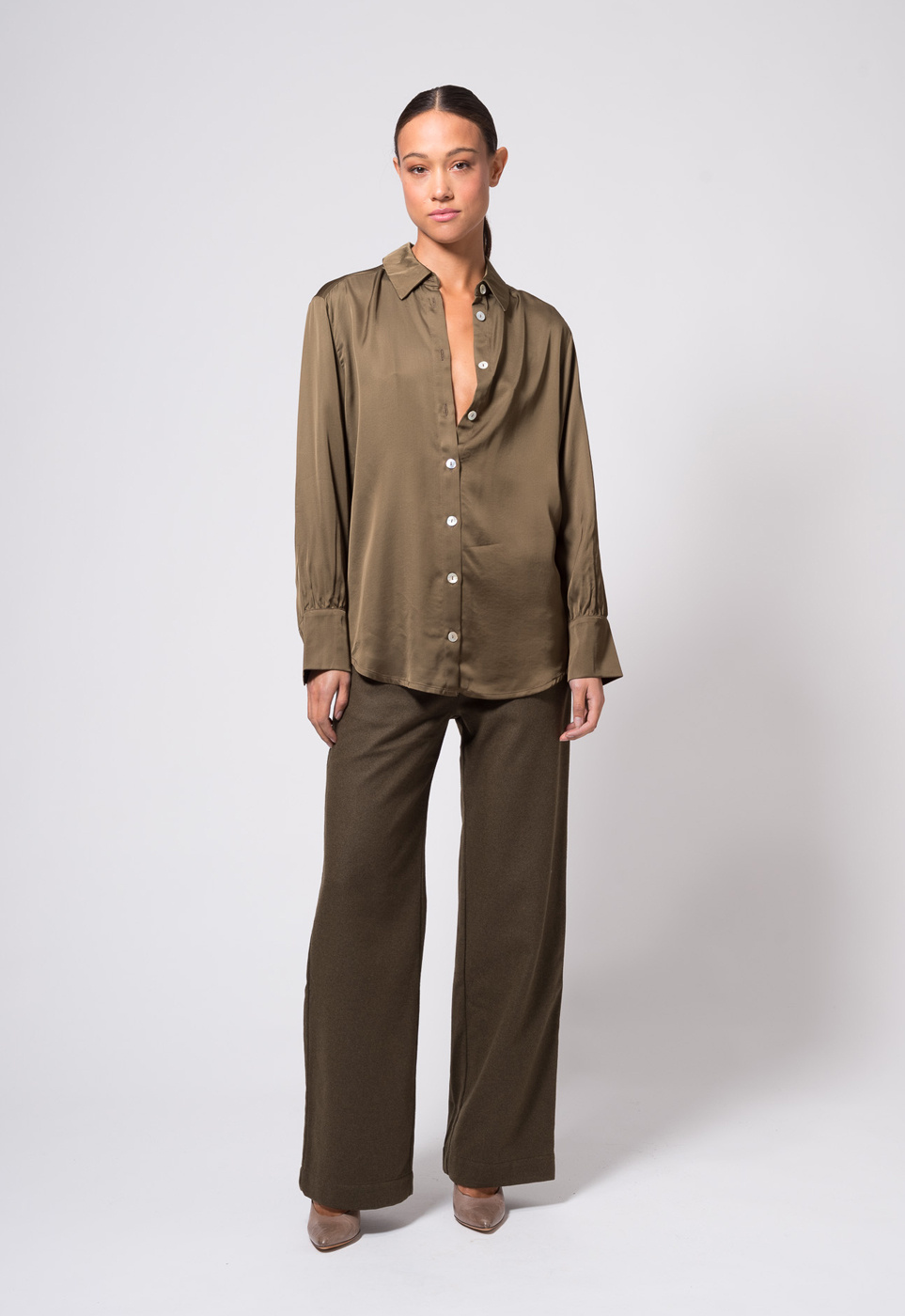 • High waist wide leg pants with zip closure, hip pockets and a welt pocket at the back, these wide-leg pants are incredibly flattering. This tailored pair is made from moss coloured wool blend. Model wears a size 34