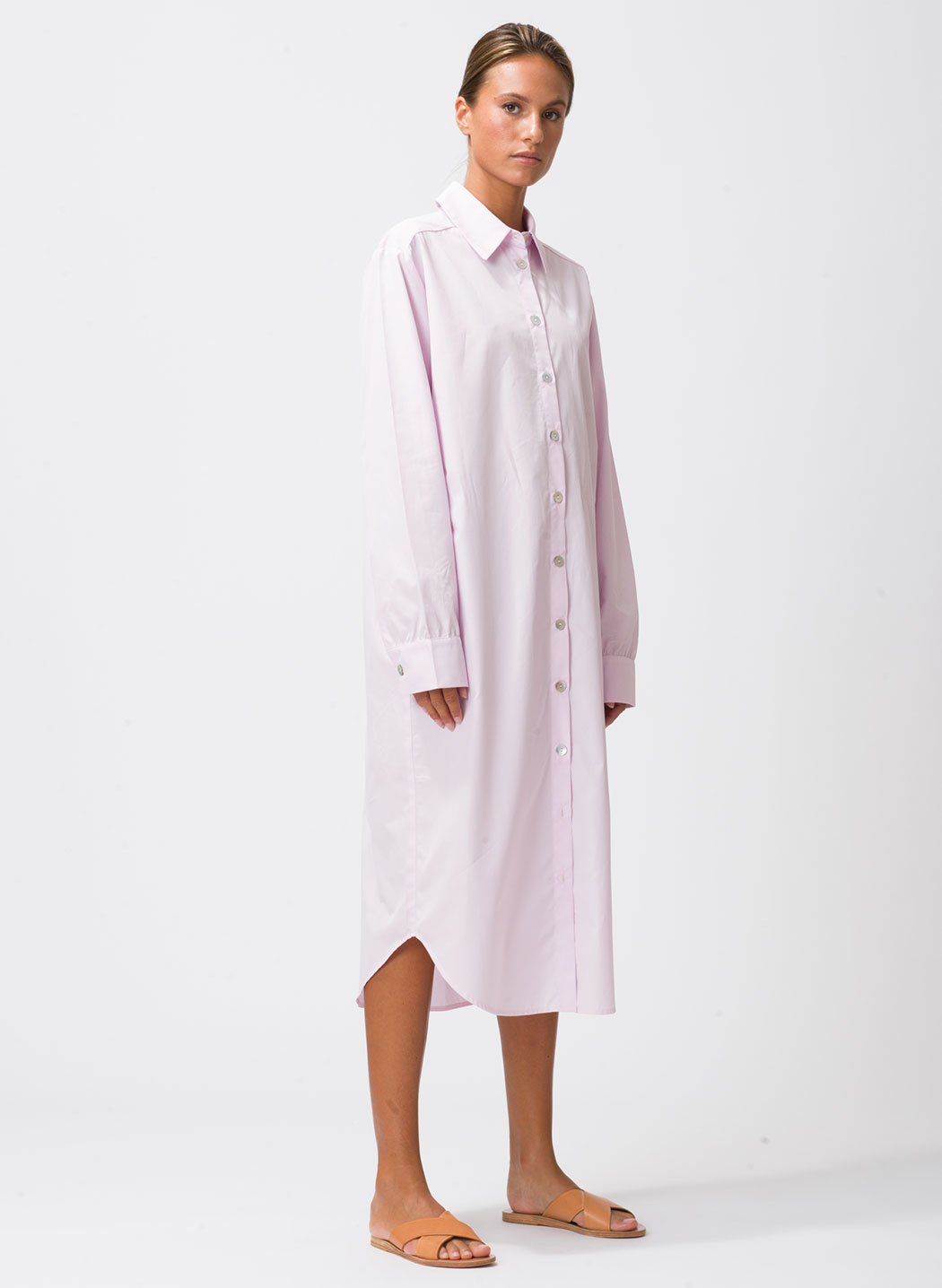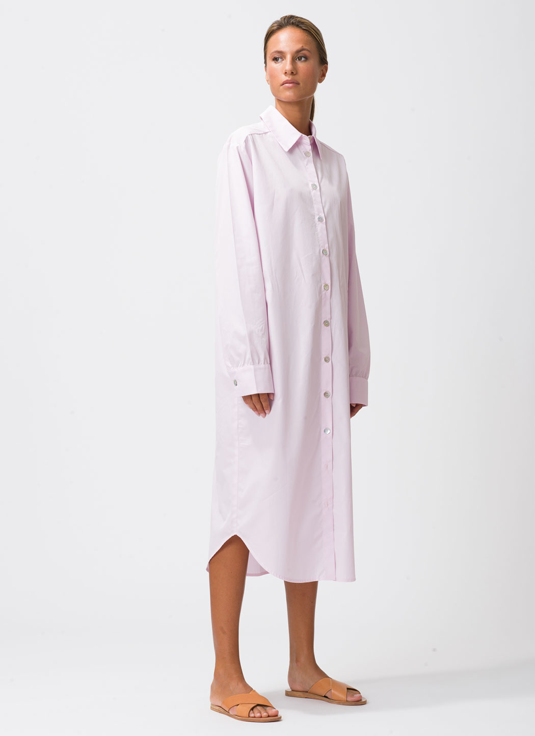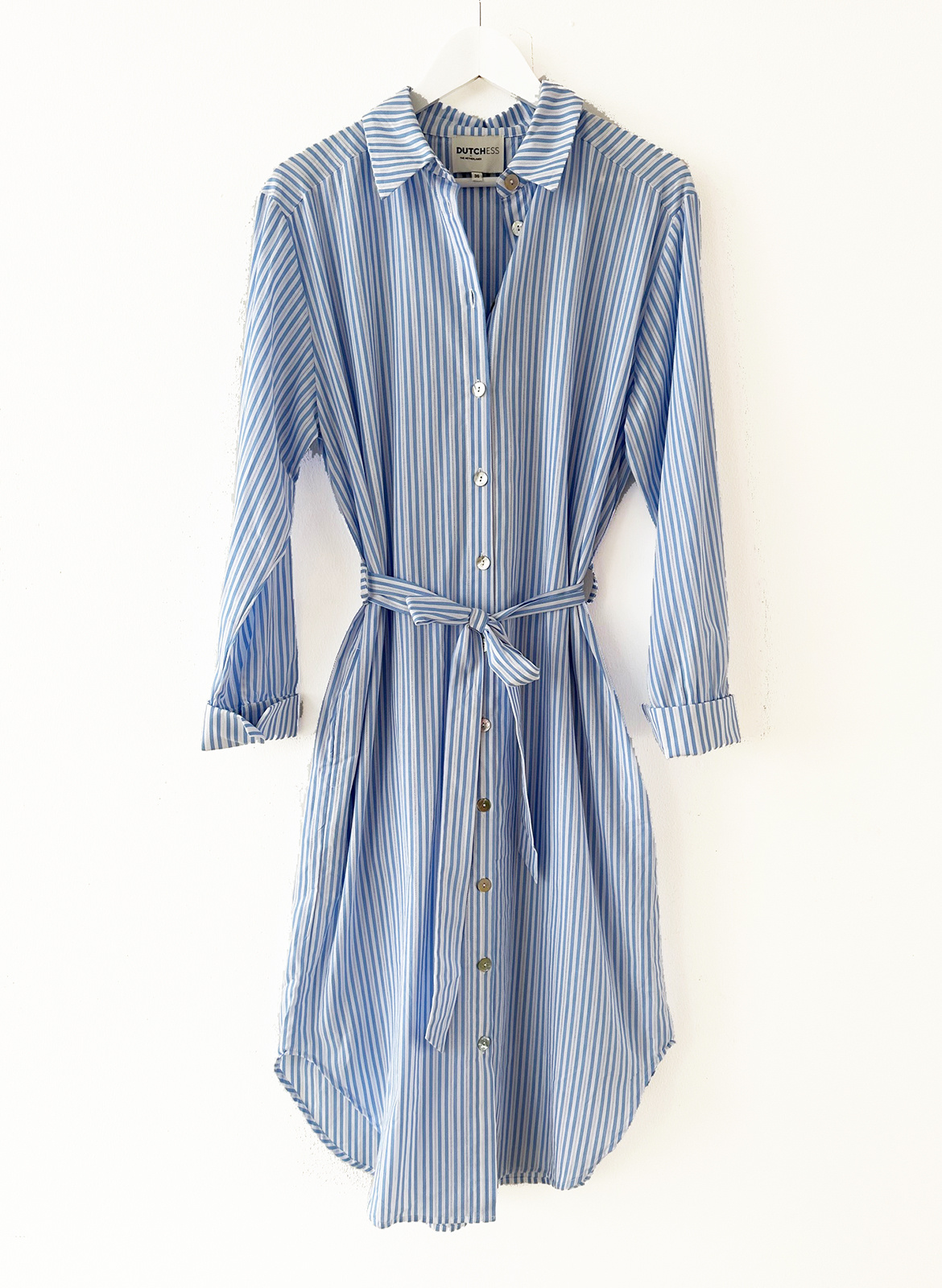 • Soepelvallende poplin overhemdjurk met kraagje en doorknoopsluiting. De jurk heeft lange mouwen met manchetten, die je op kunt rollen. Er zit een smalle riem van dezelfde stof bij. Het model draagt een maat 36.