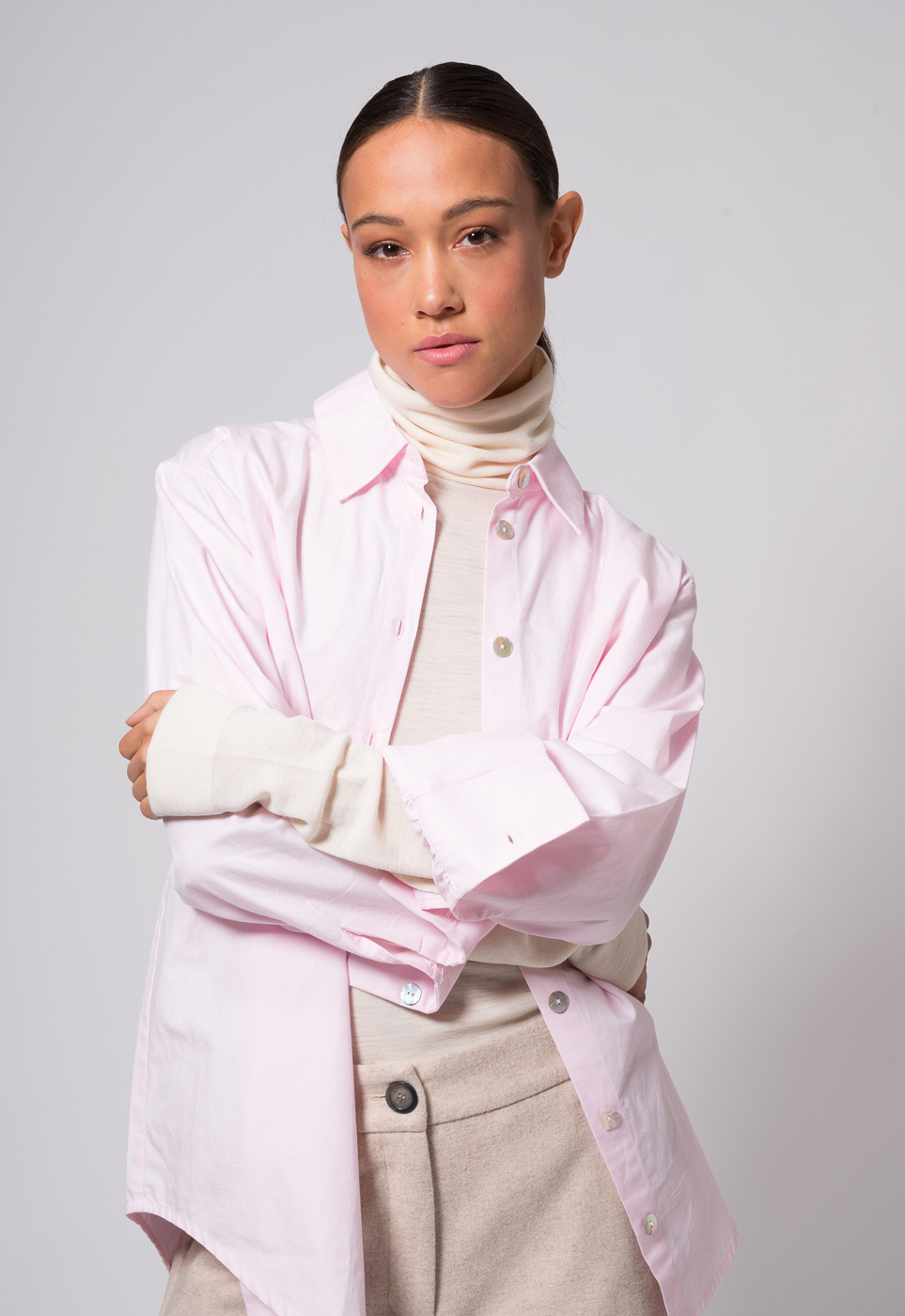 • Lichtroze soepel vallend bilogisch katoenen overhemd met kraagje en doorknoopsluiting. Het shirt heeft lange mouwen met manchetten, die je op kunt rollen. Het model draagt een maat 36.