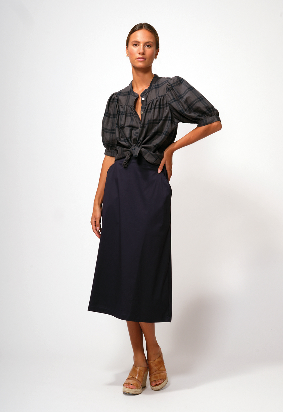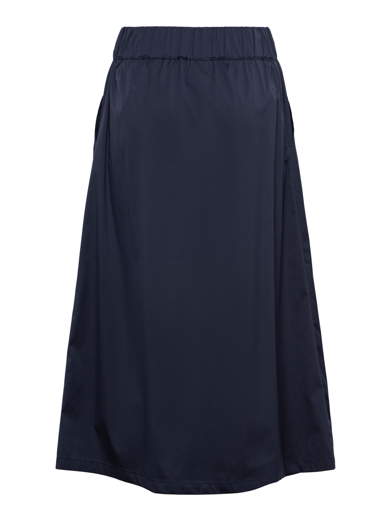 • Donkerblauwe flatterende rok van katoen met een voorpas voor en elastiek aan de achterzijde en zijzakken. De maat 36 heeft een lengte van 81 cm.