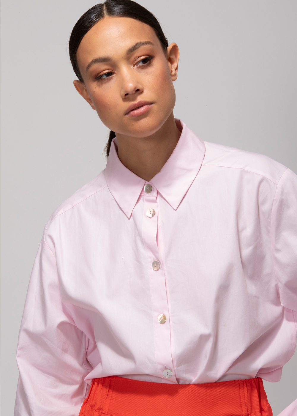 Lichtroze soepel vallend biologisch katoenen overhemd met kraagje en doorknoopsluiting. Het shirt heeft lange mouwen met manchetten, die je op kunt rollen. Het model draagt een maat 36.
