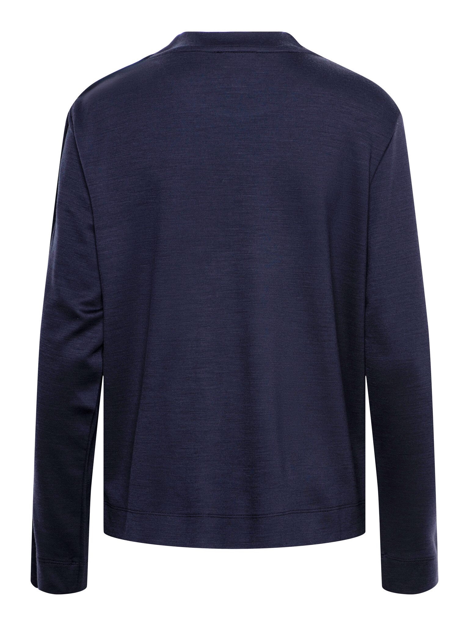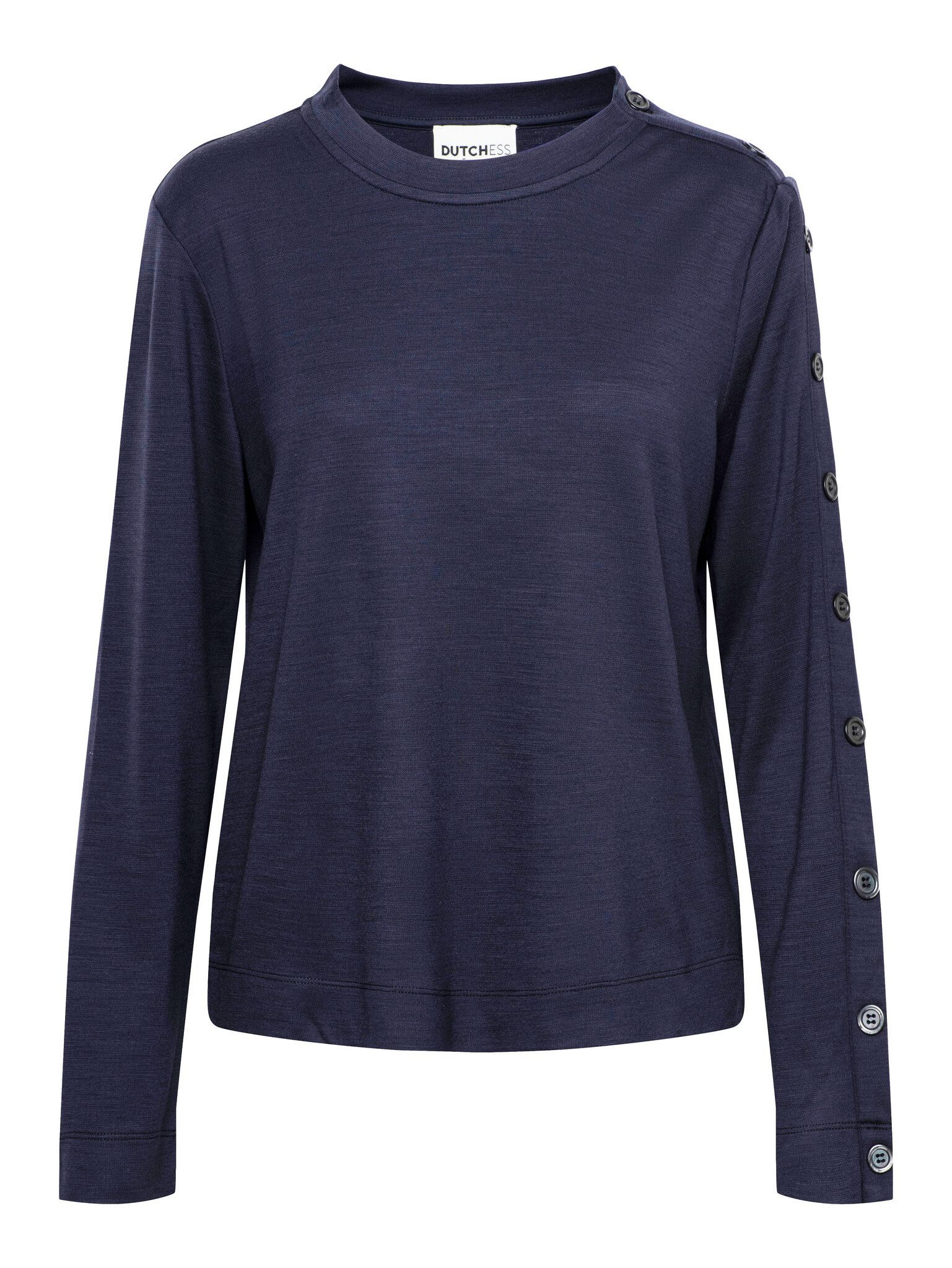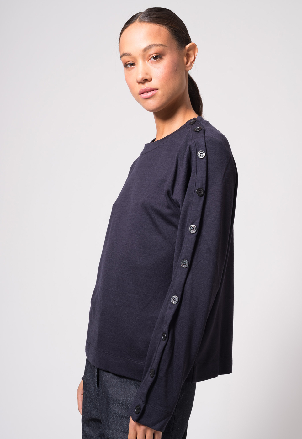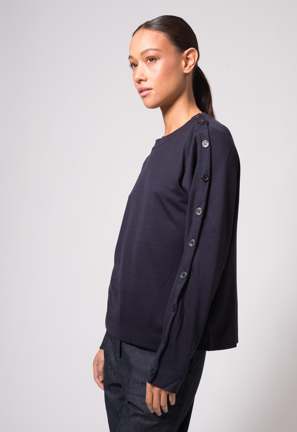Hoge taillebroek met ritssluiting aan de zijkant, zakken met gouden knopen, deze wijde uitlopendebroek is ongelooflijk flatterend. Deze nauwsluitende broek is gemaakt van een marineblauwe wolmix.