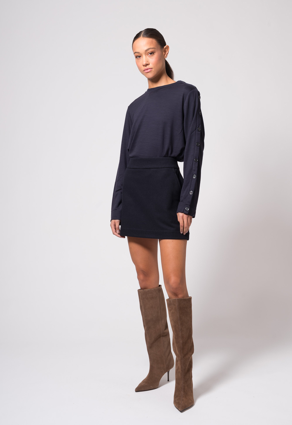 Navy korte rok van een zachte wolblend met een minimalistische en tijdloze snit. De rok heeft een comfortabele pasvorm en sluit netjes met een blinde rits aan de zijkant. Het model draagt een maat 36.
