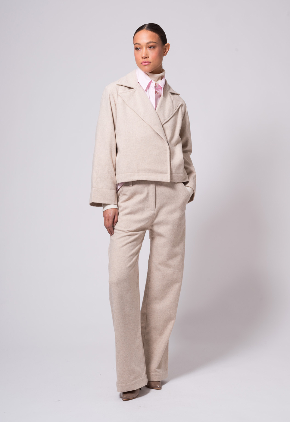 Soepel vallende taillebroek met wijduitlopende pijpen, met ritssluiting, heupzakken en een paspelzak aan de achterkant, kleur beige, deze wijduitlopende broek is ongelooflijk flatterend. Het model draagt een maat 34