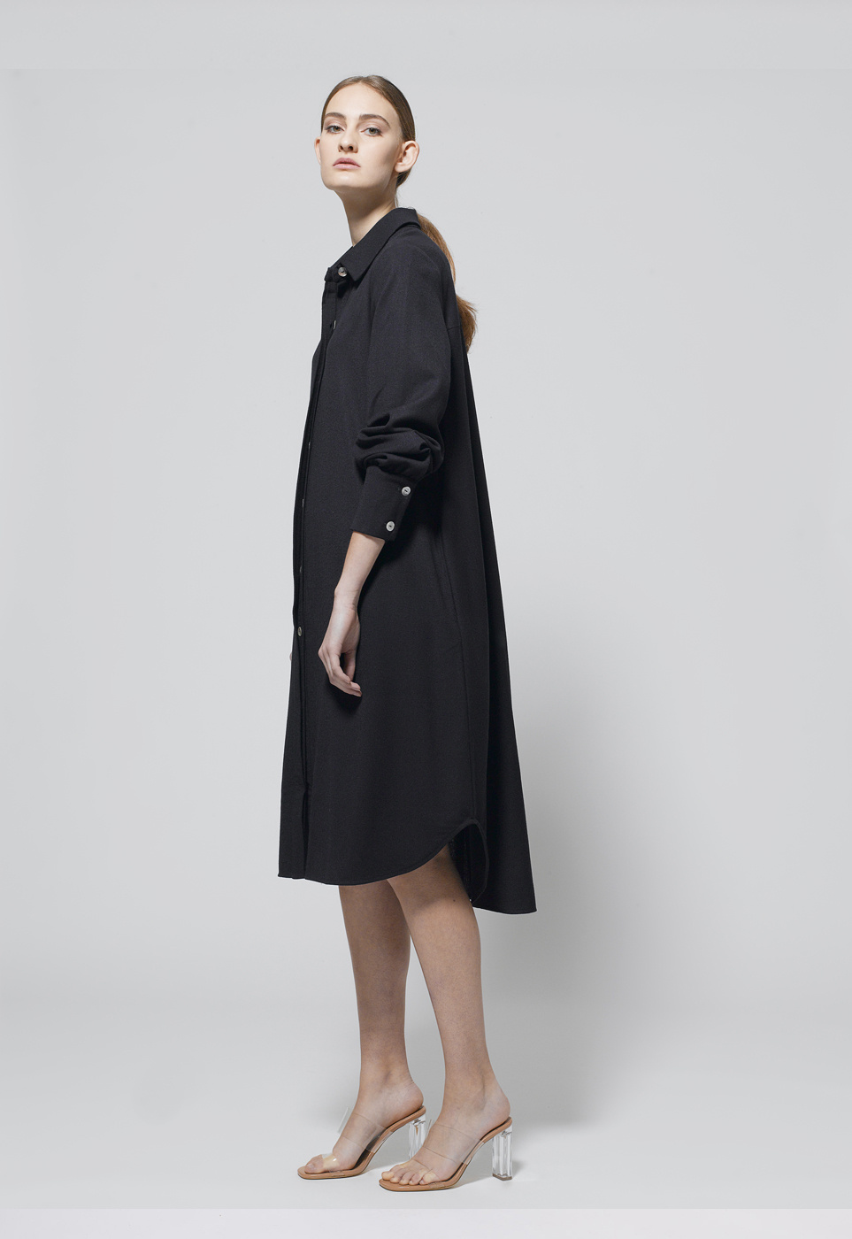 • Soepelvallende midi jurk gemaakt van een katoen viscose mix, blinde knoopsluiting met parelmoer knoopjes. De jurk heeft zijzakken en wijde mouwen met smalle manchetten. Er zit een riem van dezelfde stof bij. Het model draagt een maat 36