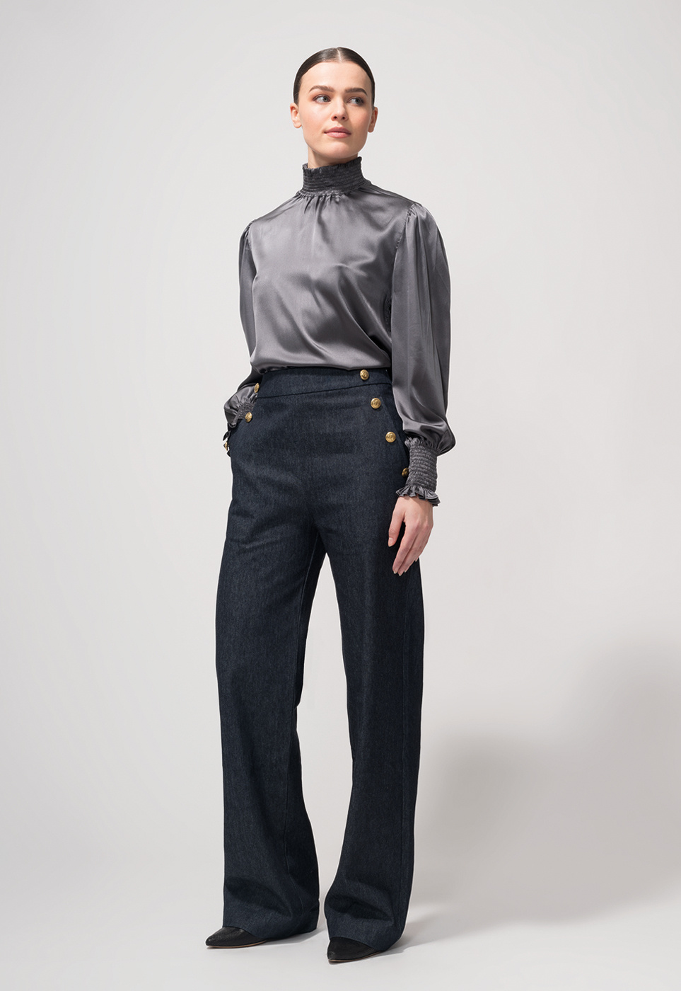 Taillebroek met wijduitlopende pijpen, ritssluiting aan de zijkant en gouden knopen op de zakken. Kleur donkere jeans, deze wijduitlopende broek is ongelooflijk flatterend.