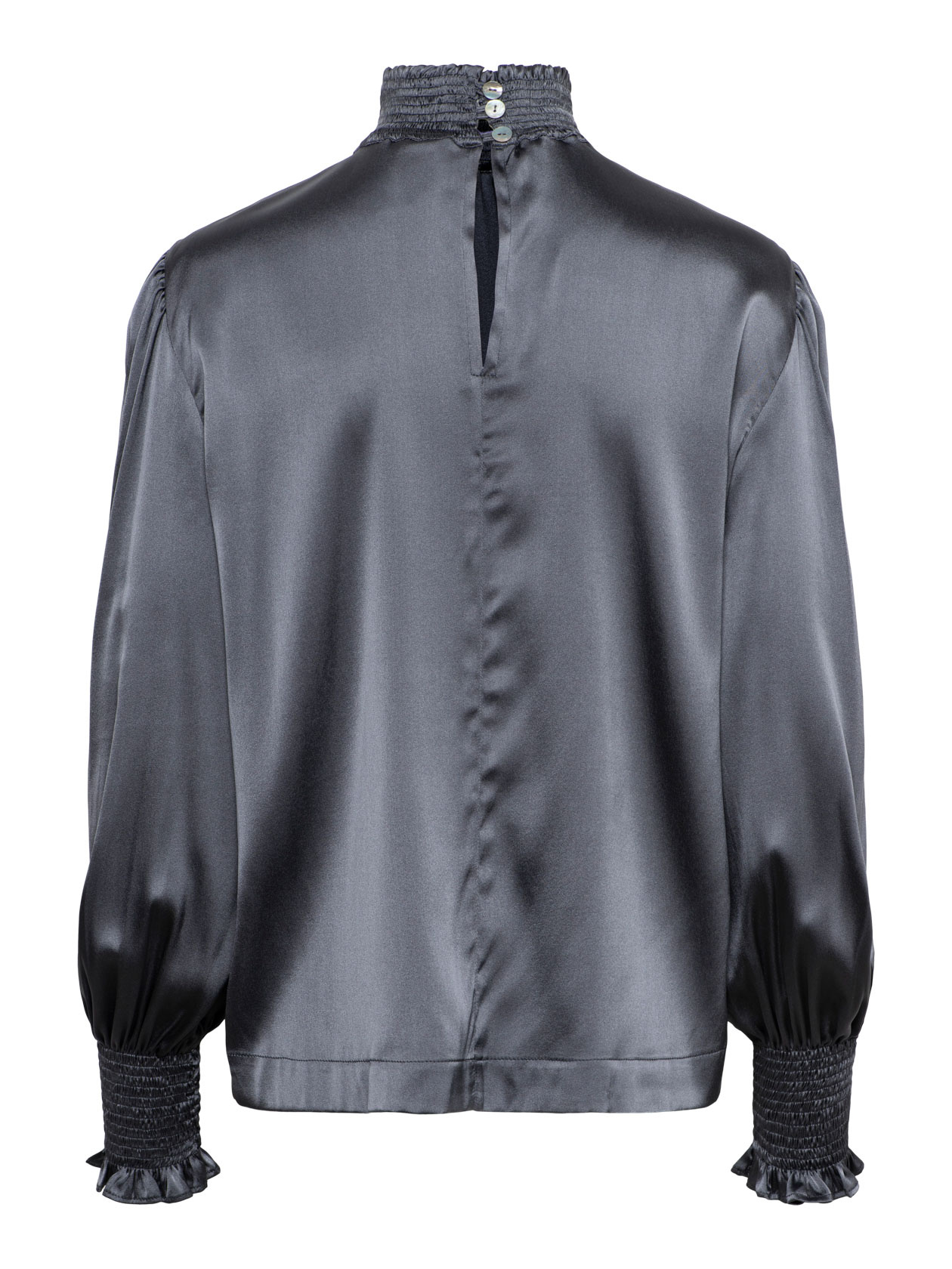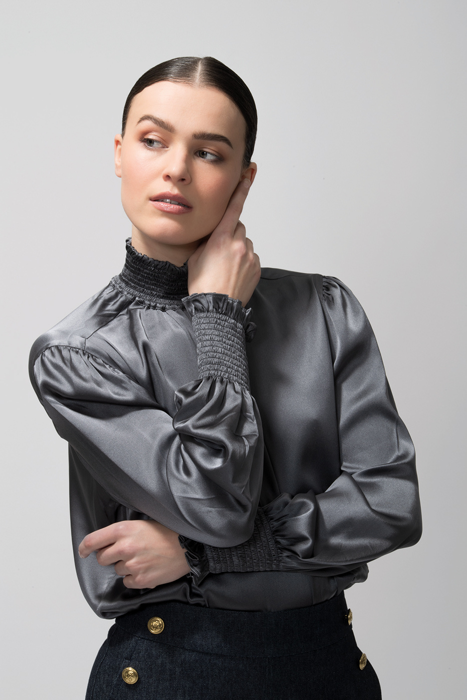 De stuart blouse heeft een gesmockte kraag die aan de achterkant sluit met 3 parelmoeren knoopjes. Lange mouwen met brede gesmockte manchetten. Het model draagt een maat 36 en is 178cm, valt op maat.